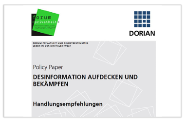 In the policy paper series of the research group "Forum Privatheit", scientists from the interdisciplinary research project DORIAN publish a paper that explains how disinformation can be detected and contained. CRISP scientist Dr. Michael Kreutzer, Fraunhofer SIT, is one of the authors of the paper.