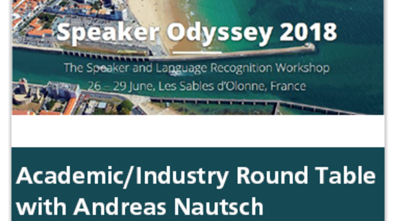 Andreas Nautsch, Hochschule Darmstadt diskutierte mit fünf Experten aus Forschung und Industrie bei einer Podiumsdiskussion auf der Speaker Odyssey 2018 über "challenges & evaluations", "dynamics of the Collaboration (role of Academia and Industry)", "Deep Learning and its impact on how we collaborate", "the role of professional organisations / associations" und "collaboration depending on maturity of technology".